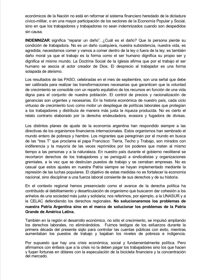 “Es inadmisible que se pretenda eliminar el derecho a la indemnización con un seguro pagado por el mismo trabajador, subiendo los costos empresarios Pymes o haciendo cargo al mismo Estado, descontrolando el mercado laboral”, suscribieron los integrantes y remarcaron: “Indemnizar significa reparar un daño. No es un daño cualquiera, nuestra subsistencia, nuestra vida, es agredida; necesitamos comer el alimento esencial que nos nutre y lo haremos dentro de la ley o fuera de la ley. Es también daño moral ya que el trabajo es la forma como el ser humano dignifica su propio ser y dignifica el mismo mundo”.