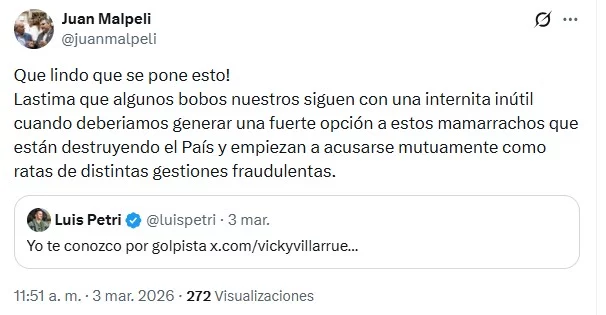 Fue ese escenario el que Malpeli observó desde la vereda de enfrente y aprovechó para lanzar su mensaje. Porque el tuit tiene dos filos: critica a los libertarios, pero también le pega a su propio espacio. El peronismo, señaló, no está en condiciones de capitalizar nada mientras siga enredado en su propia “internita inútil”.