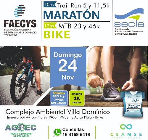El evento es abierto a toda la comunidad y comenzará a las 10 horas la Maraton Trail Run y a las 12 se hará la prueba Bike MTB de 23 y 46K, con entrada libre y gratuita para los afiliados al SECLA y AGOEC. Habrá premios para las diferentes categorías, estadías turísticas, sorteos, sorpresas y más.