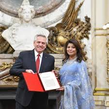 El presidente Alberto Fernández encabezó en la Casa Rosada la ceremonia de recepción de las cartas credenciales de 20 nuevos embajadores y embajadoras de Chile, España, Irlanda, Israel, Malasia, Nicaragua, Países Bajos, Suiza, Tailandia, Venezuela, Bahrein, Bangladesh, Barbados, Belice, Botswana, Chipre, Kazajistán, Mongolia, Namibia y Trinidad y Tobago, a quienes les dio la bienvenida como representantes de sus países ante la Argentina.