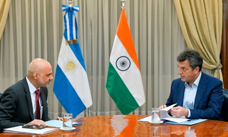 El ministro de Economía, Sergio Massa, recibió este martes al embajador de la República de la India, Dinesh Bhatia, para repasar la agenda económica y comercial bilateral con el objetivo de ampliar la oferta exportable argentina hacia el gigante asiático.