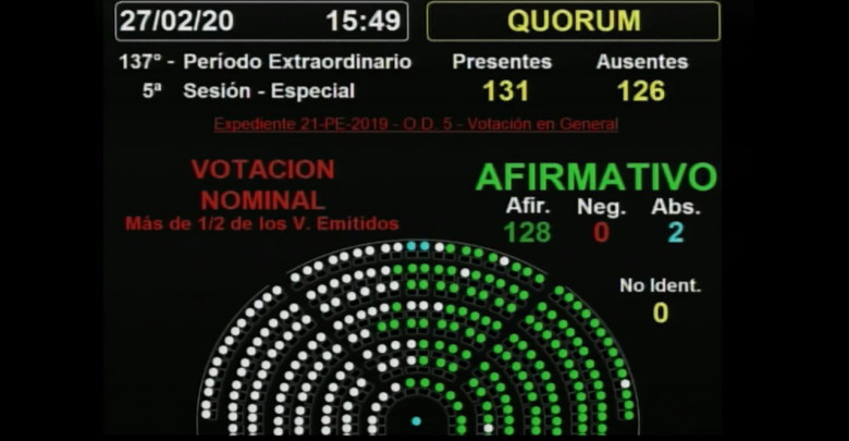 La iniciativa fue aprobada por 128 votos positivos y dos abstenciones. El interbloque opositor se fue de la sesión tras considerar inválido el quórum por la participación del diputado y futuro embajador en Brasil, Daniel Scioli.