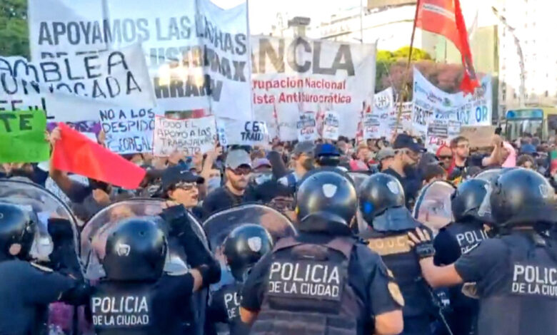 Hasta ahora, los descontentos intentan cortar las principales vías de la capital, Buenos Aires. Sobre la avenida Corrientes, medular para el tráfico, el cordón policial no solo procura bloquear la acción, sino que ha lanzado gas pimienta a los manifestantes para hacerlos retroceder. El uso de porras también se ha visto en algunos videos compartidos por la prensa local.