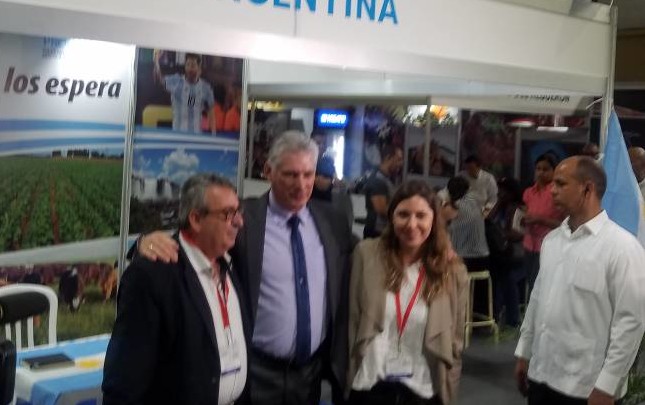 El mandatario cubano se detuvo a dialogar con los empresarios argentinos en un stand decorado con imágenes de los astros futbolísticos Diego Maradona y Lio Messi, entre los colores albicelestes de las banderas, y posó para la foto junto a Juan Amato y Débora Bringas, quien es la representante del Grupo Sur, uno de los socios más sólidos con los que cuenta Cuba en provisión de alimentos para la Isla.