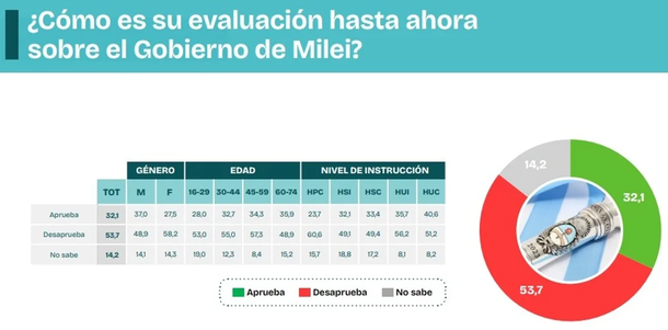 En cuanto a la imagen del Presidente, “cayó tres puntos”: “Las opiniones mayoritarias (53%) indican que el gobierno atraviesa una ‘crisis’, al punto que más del 25% de su propia base de apoyo también lo considera así”, sostuvieron en el análisis de los datos.