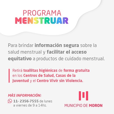 El Municipio de Morón avanza con la implementación del programa “MENSTRUAR” que consiste en la entrega de toallas higiénicas descartables en los Centros de Atención Primaria de la Salud (CAPS), las Casas de la Juventud y el Centro Municipal “Vivir sin Violencia”.