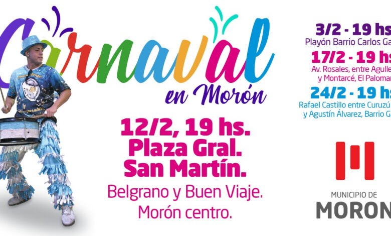 El gran festejo de carnaval será el lunes 12, que se llevará a cabo en la plaza central de Morón, y contará con la presentación de la Banda de Sikuris, Los Gallitos de Gaona, Lxs Gardelitos, Por Siempre Murgueros, Siré Siré, La Chillinga, Kuyén Tambor, Los Galanes y Los Incomparables.