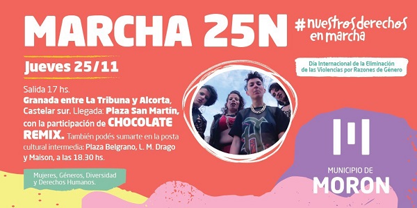 La movilización pasará por la Plaza Belgrano, en Luis María Drago y Maisón, a las 18:30 y por el Palacio de Tribunales de Morón. El recorrido finalizará cerca de las 19 en la Plaza Gral. San Martín de Morón, en Belgrano y Buen Viaje, con un show en vivo a cargo de Mica Legui y Chocolate Remix.
