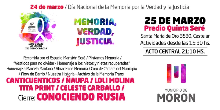 Para conmemorar el día de la Memoria por la Verdad y la Justicia y los 40 años de democracia, el Municipio de Morón organizó una jornada de diversas actividades en el Predio Quinta Seré — Polideportivo Gorki Grana para el próximo sábado 25 de marzo desde las 15:30. Habrá propuestas culturales para toda la familia y shows en el escenario principal desde las 16.30 con Canticuénticos, Ñaupa, Loli Molina, Tita Print y Celeste Carballo. Finalmente, el cierre estará a cargo de Conociendo Rusia, que se presentará luego del acto central encabezado por representantes de organismos de Derechos Humanos bajo las consignas “Memoria, Verdad y Justicia para defender la Democracia” y “Corporación judicial nunca más”.