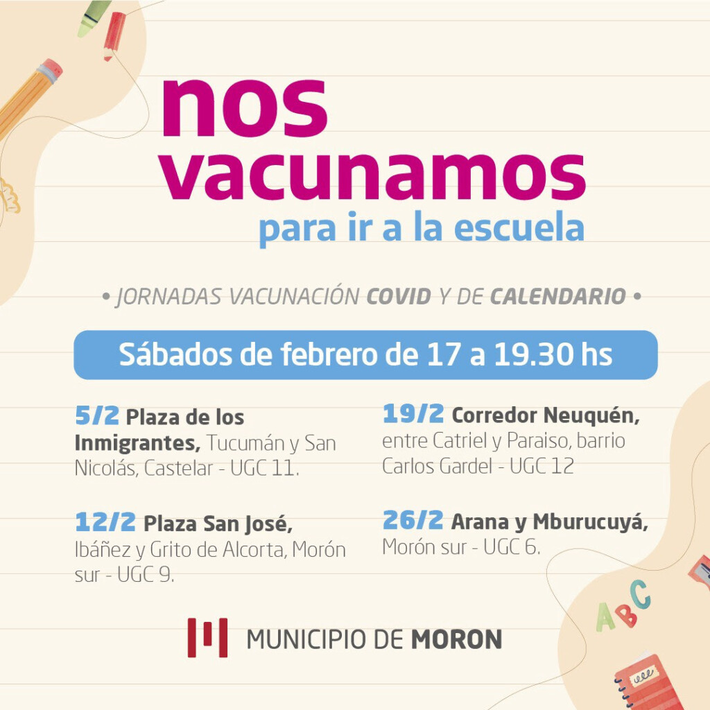 En el marco de la campaña “Nos vacunamos para ir a la escuela”, que el presidente Alberto Fernández lanzó en Morón, durante los sábados de febrero habrá nuevas postas de inoculación en varios puntos del distrito. Se aplicarán primera y segunda dosis libre contra el coronavirus y también del resto del calendario obligatorio, a partir de los 3 años.