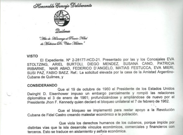 El Consejo Deliberante de Quilmes celebró dos sesiones en forma presencial en el Teatro Municipal por las condiciones impuestas por las restricciones de la pandemia, en la del 10 de agosto, la militancia solidaria de la Casa de la Amistad Argentino-Cubana de Quilmes, impulsó a través de concejales populares una declaración del máximo órgano deliberativo del municipio quilmeño, el que fue tomado y presentado al pleno del Concejo Deliberante.