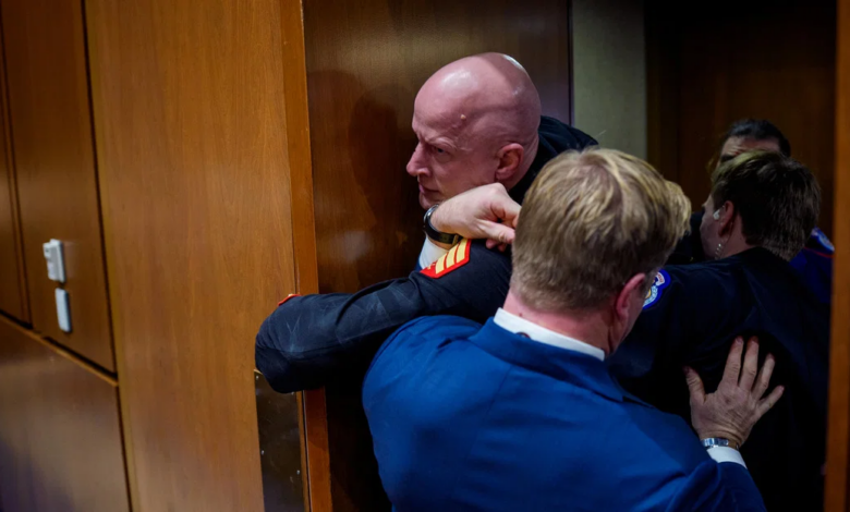 De acuerdo con videos difundidos del incidente, tres oficiales intentaron sacarlo del recinto mientras el senador republicano Tim Sheehy, de Montana, también participó en la expulsión del manifestante. Durante el forcejeo, el veterano sufrió una fractura en el brazo.