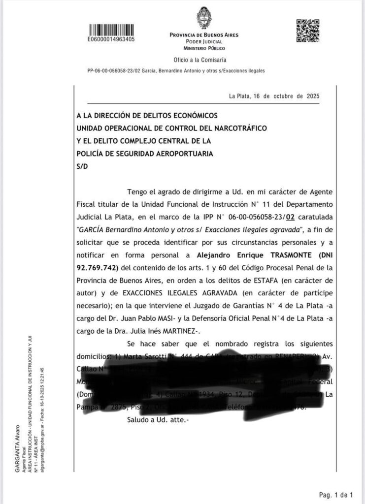 Según el diario El Día de La Plata se le envió una comunicación oficial a la Dirección de Delitos Económicos de la PSA “a fin de solicitar que se proceda identificar por sus circunstancias personales y a notificar en forma personal a Alejandro Enrique Trasmonte del contenido de los arts. 1 y 60 del Código Procesal Penal de la Provincia de Buenos Aires, en orden a los delitos de estafa (en carácter de autor) y de exacciones ilegales agravada (en carácter de partícipe necesario)”.