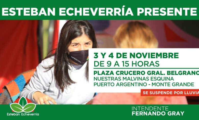 Durante los días jueves 3 y viernes 4 de noviembre, de 9 a 15 horas, el Municipio de Esteban Echeverría y el Registro Provincial de las Personas realizarán operativos de Esteban Echeverría Presente y Documentación en la plaza Crucero General Belgrano (Nuestras Malvinas esquina Puerto Argentino, Monte Grande).