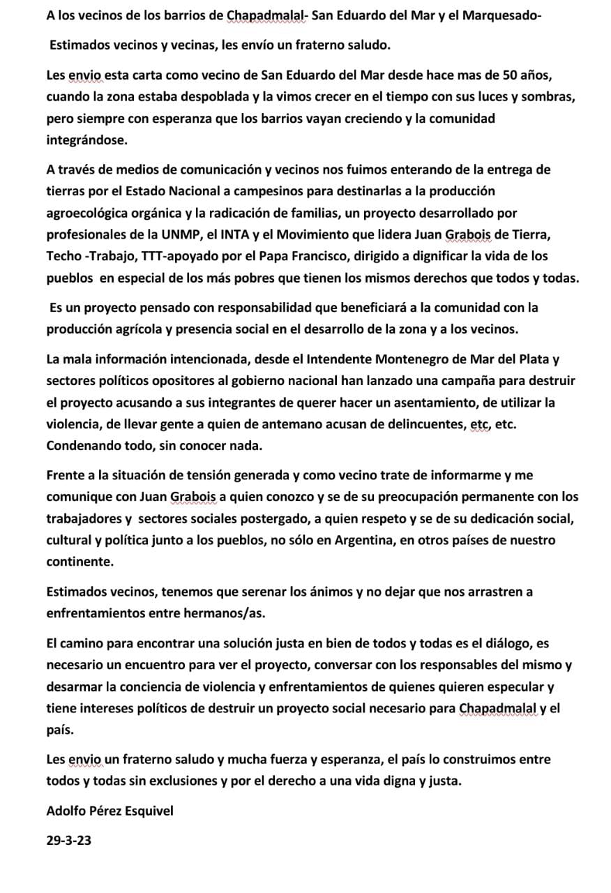 «Estimados vecinos, tenemos que serenar los ánimos y no dejar que nos arrastren a enfrentamientos entre hermanos/as». «El camino para encontrar una solución justa en bien de todos y todas es el diálogo, es necesario un encuentro para ver el proyecto, conversar con los responsables del mismo y desarmar la conciencia de violencia y enfrentamientos de quienes quieren especular y tiene intereses políticos de destruir un proyecto social necesario para Chapadmalal y el país».