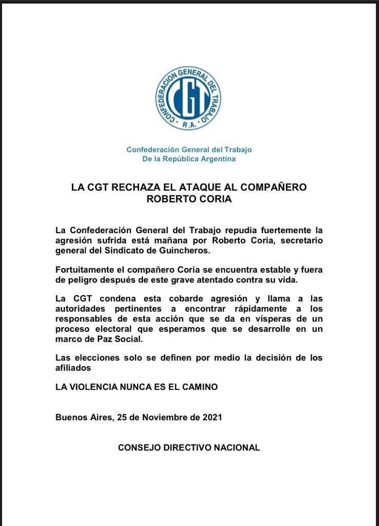 Por último, las y los dirigentes redactaron un comunicado en repudio al ataque que sufrió Roberto Coria, secretario General del Sindicato de Guincheros, en la previa a las elecciones que el Gremio llevará adelante hoy. “La CGT condena esta cobarde agresión y llama a las autoridades pertinentes a encontrar rápidamente a los responsables de esta acción que se da en vísperas de un proceso electoral, que esperamos que se desarrolle en un marco de Paz social”, dijo el comunicado de la Central.