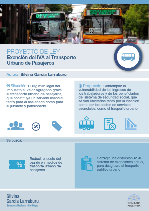 La Senadora Silvina García Larraburu presentó un proyecto de ley para que los servicios de transporte urbano de pasajeros estén exentos del Impuesto al Valor Agregado. La iniciativa fue impulsada a raíz de una comunicación del Concejo Deliberante de Bariloche y en particular del Concejal e integrante de la Comisión de Transporte, Gerardo Ávila.