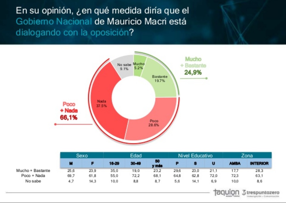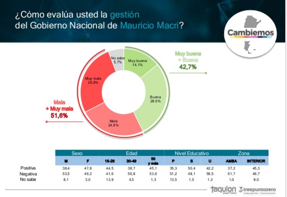 En un relevamiento nacional realizado por Taquion y Trespuntozero, sobre el escenario sociopolítico y credibilidad, los resultados demuestran un claro cambio de humor social contraria a los intereses del gobierno de Mauricio Macri.