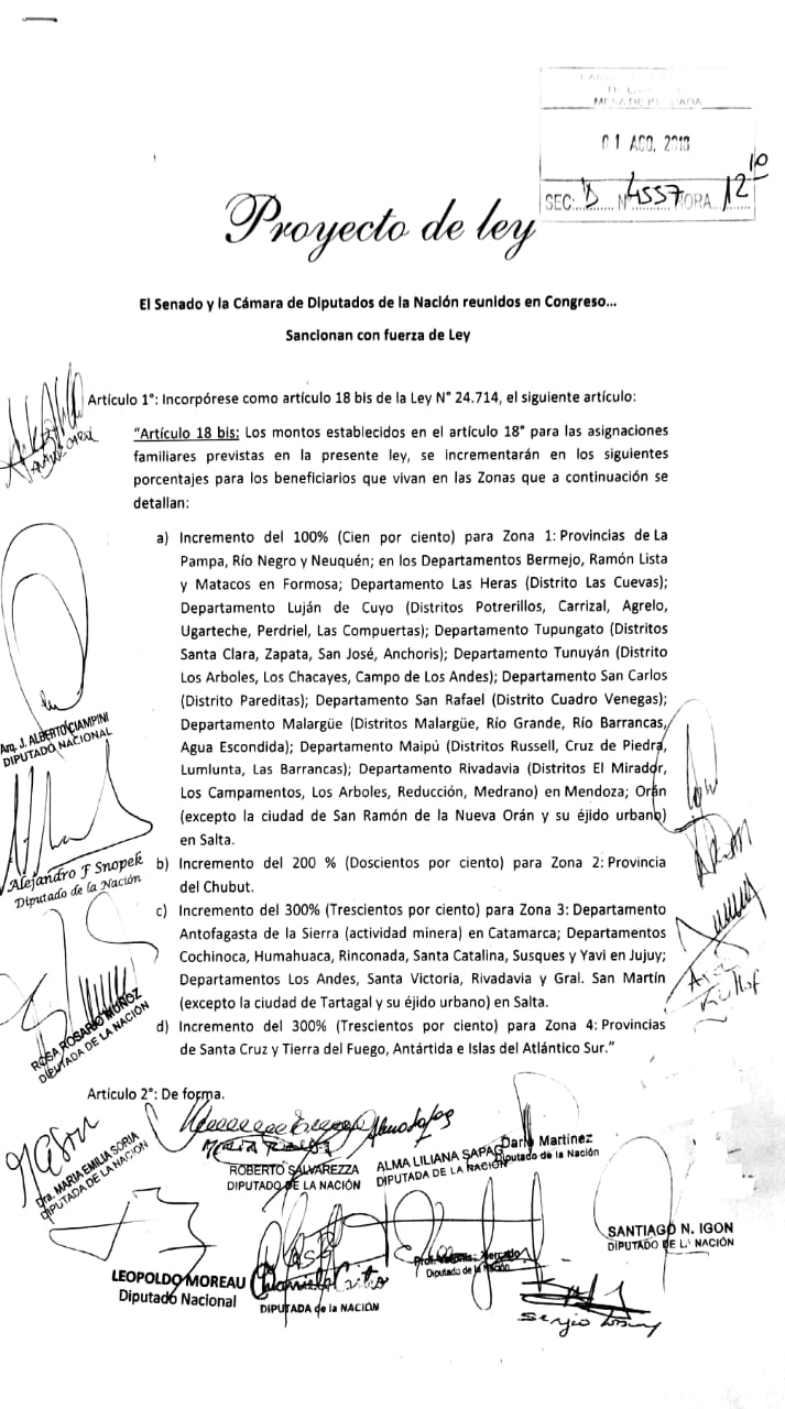 Con la presencia entre otros de la Senadora Nanci González (Chubut), y los Diputados Nacionales Graciela Camaño, Daniel Arroyo, Mirta Tundis, Carlos Snopek del Frente Renovador, Alma Sapag (MPN), Agustín Rossi, Axel Kicillof del FpV-PJ, el plenario decidió avalar una presentación judicial y proyectos destinados a establecer por Ley los montos diferenciales de las asignaciones familiares para la Patagonia y otras zonas desfavorables, a derogar el decreto 702/18 firmado por el Presidente Macri que los elimino.