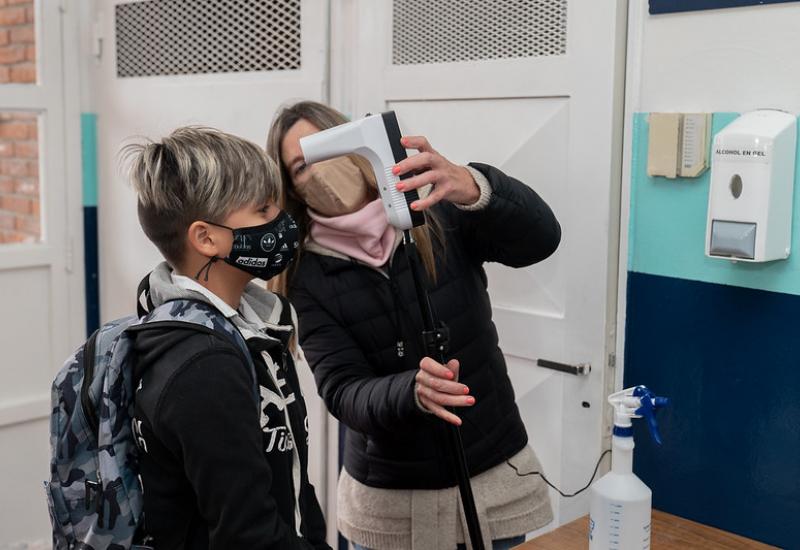 Antes de ingresar cada alumno pasa por un círculo ubicado en piso para desinfectar su calzado. Luego se le toma la temperatura y se le coloca alcohol en gel en las manos. También se desinfectan las mochilas.
