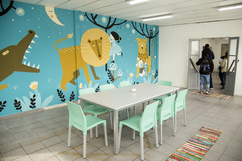 Para recibir a los alumnos del mejor modo, la Subsecretaría General de Cultura de San Isidro les encomendó a dos artistas visuales residentes en el municipio la realización de murales en lugares privilegiados del edificio. El resultado, en el caso de Rocío Alejandro, fue una obra de base azul, muy colorida, con muchas plantas y flores, y amistosos cocodrilos y leones entre niños y niñas.
