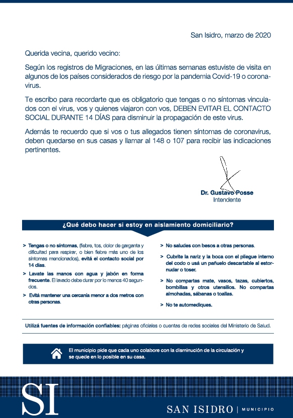 Con información que brinda Migraciones, en la que se especifica el país donde estuvo la persona y sus datos de contacto, el intendente Gustavo Posse envió cartas personalizadas a cada uno. “Te escribo para recordarte que es obligatorio que –tengas o no síntomas–, vos y quienes viajaron con vos, deben evitar el contacto social durante 14 días para disminuir la propagación de este virus”, dice la misiva del jefe comunal de San Isidro.
