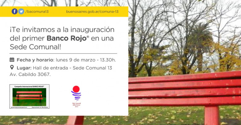En el marco del Día Internacional de la Mujer, la Comuna 13 inaugurará este lunes, a las 13.30hs, en su hall de entrada, un Banco Rojo y, de esta manera, se sumará a este proyecto de prevención que busca concientizar sobre la violencia de género y los femicidios.