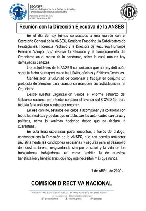 En el día de hoy fuimos convocados a una reunión con el Secretario General de la ANSES, Santiago Fraschina, la Subdirectora de Prestaciones, Florencia Pacheco y la Directora de Recursos Humanos Berenice Vampa, para evaluar la situación y el funcionamiento del Organismo en el marco de la pandemia, sobre la cual, aún no hay demasiadas certezas.