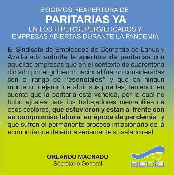 El Sindicato de Empleados de Comercio de Lanús y Avellaneda solicita la apertura de paritarias con aquellas empresas que en el contexto de cuarentena dictado por el gobierno nacional fueron consideradas con el rango de “esenciales” y que en ningún momento dejaron de abrir sus puertas, teniendo en cuenta que la paritaria está vencida, por lo cual no hubo ajustes para los trabajadores mercantiles de esos sectores, que estuvieron y están al frente con su compromiso laboral en época de pandemia y que sufren el permanente proceso inflacionario de la economía que deteriora seriamente su salario real.