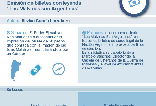 La iniciativa fue impulsada tras la disposición del Poder Ejecutivo Nacional de discontinuar la impresión del billete de 50 pesos con la imagen de las Islas Malvinas, reemplazándola por un Cóndor.