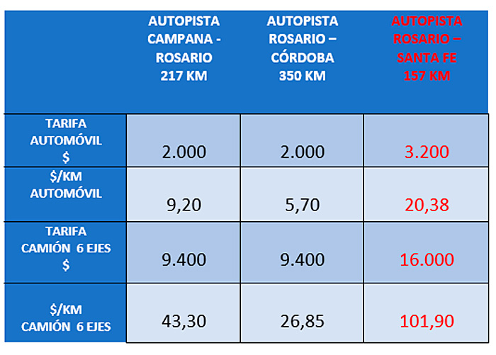 “CAMIÓN DE 6 EJES, DE ROSARIO A SANTA FE O VICEVERSA, IDA Y VUELTA, REALIZANDO 20 VIAJES POR MES, POR AÑO PAGARÁ LA SUMA DE $ 7.680.000.-, SOLO DE PEAJE”.
