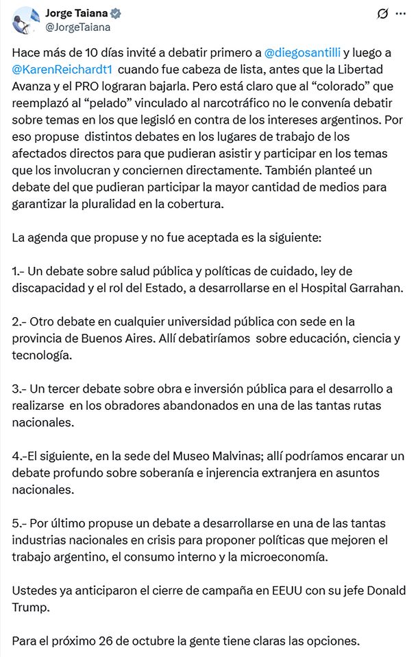 Ustedes ya anticiparon el cierre de campaña en EEUU con su jefe Donald Trump. Para el próximo 26 de octubre la gente tiene claras las opciones”, concluye el texto de Jorge Taiana publicado en X y otras redes.