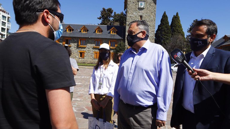 El Intendente y el secretario de Turismo de Bariloche recibiendo turistas en el tradicional «Centro Cívico»