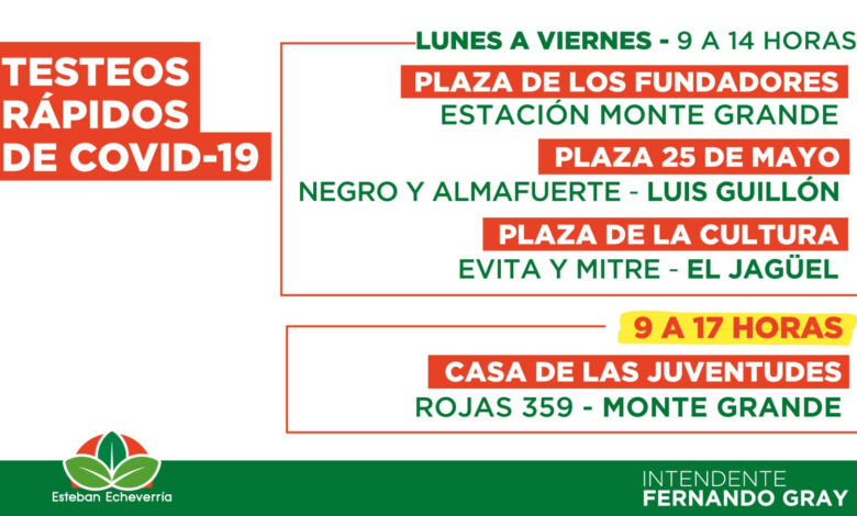 De lunes a viernes, el Municipio de Esteban Echeverría continúa realizando testeos gratuitos de COVID-19 en distintos puntos del distrito. La atención es sin turno previo y los resultados se entregan luego de 15 minutos de realizada la prueba.
