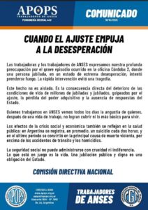 Desde el gremio señalaron que “el hecho no puede analizarse como un caso aislado, sino como una manifestación directa del deterioro de las condiciones de vida de millones de jubiladas y jubilados en el marco de las políticas de ajuste económico, la pérdida del poder adquisitivo y la falta de respuestas estatales adecuadas”.
