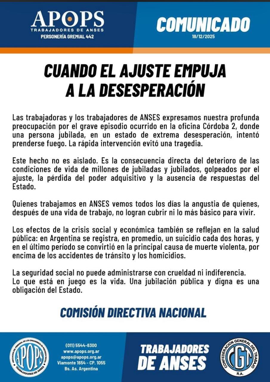La Asociación del Personal de los Organismos de Previsión Social (APOPS), que nuclea a trabajadoras y trabajadores de ANSES, expresó su profunda preocupación por un grave episodio ocurrido en la oficina Córdoba 2, donde una persona jubilada, en un contexto de extrema desesperación, intentó prenderse fuego. La rápida intervención del personal evitó que la situación derivara en una tragedia.