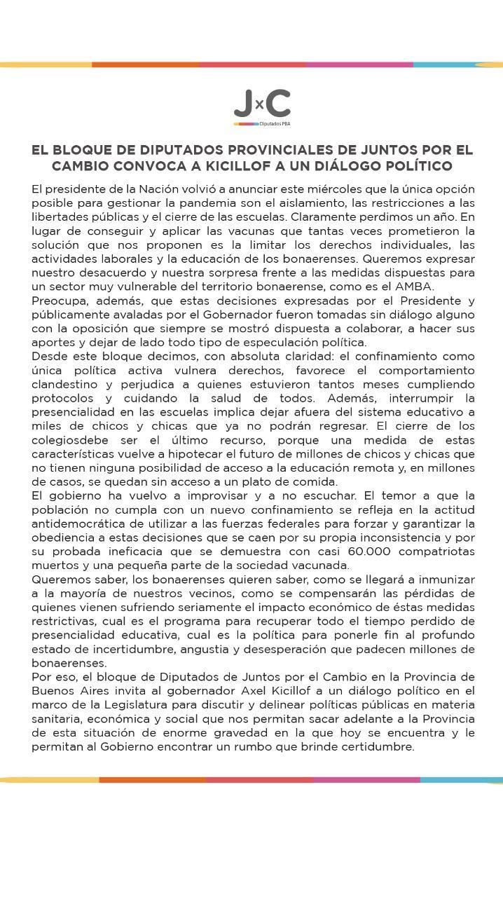 A las puertas de una nueva sesión de la cámara de diputados, los legisladores de Juntos por el Cambio emitieron un duro comunicado repudiando las medidas adoptadas por el gobierno nacional y provincial, condenando el cierre de escuelas y pidiendo “dialogo político al gobernador Kicillof”.