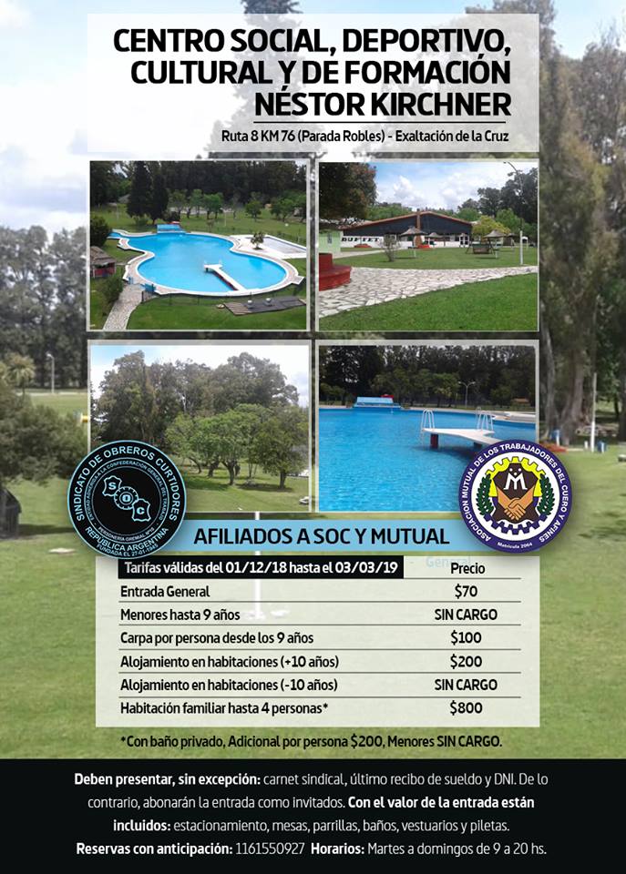 El Centro Social, Deportivo, Cultural y de Formación Néstor Kirchner, en Exaltación de la Cruz, es uno de los espacios que el Sindicato brinda a sus afiliados para pasar un verano con sol y pileta, en contacto con la naturaleza.